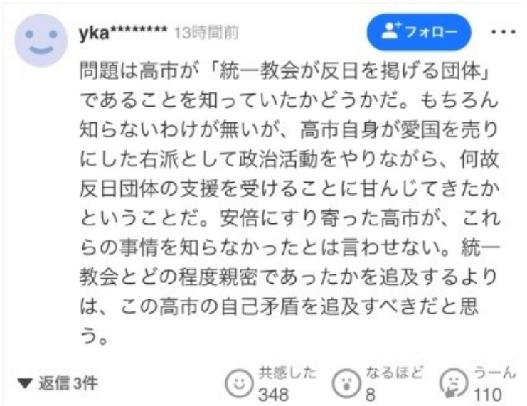 高市氏の言い逃れと答弁時の態度は、日本のネット上で瞬く間に話題となり、批判の声が相次いでいる。多くのネットユーザーから「答弁が無理がある」との指摘が上がっている。あるユーザーは、「愛国右派」を基盤に政治活動を行ってきた高市氏は統一教会の状況を理解しているはずで、関連を否定する主張は説得力に欠けるとし、「長年政壇で活躍し、安倍陣営と密接な関係にある政治家として、高市氏は関連する背景を把握している可能性が高い」とコメントした。