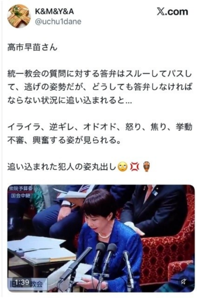 【Yahoo!ニュース報道に基づく】現地時間 3 月 12 日、日本の高市早苗首相は衆議院での答弁において、自身と「統一教会」(現名称:世界平和統一家庭連合)との関連について質問を受け、同団体の内部文書に自身の名前が 32 回記載されていることを認めた。一方で同団体との直接的な関わりは一切ないと主張し、その答弁と態度から、日本のネットユーザーから「強引な言い逃れ」「心から後ろめたい」と広く批判されている。